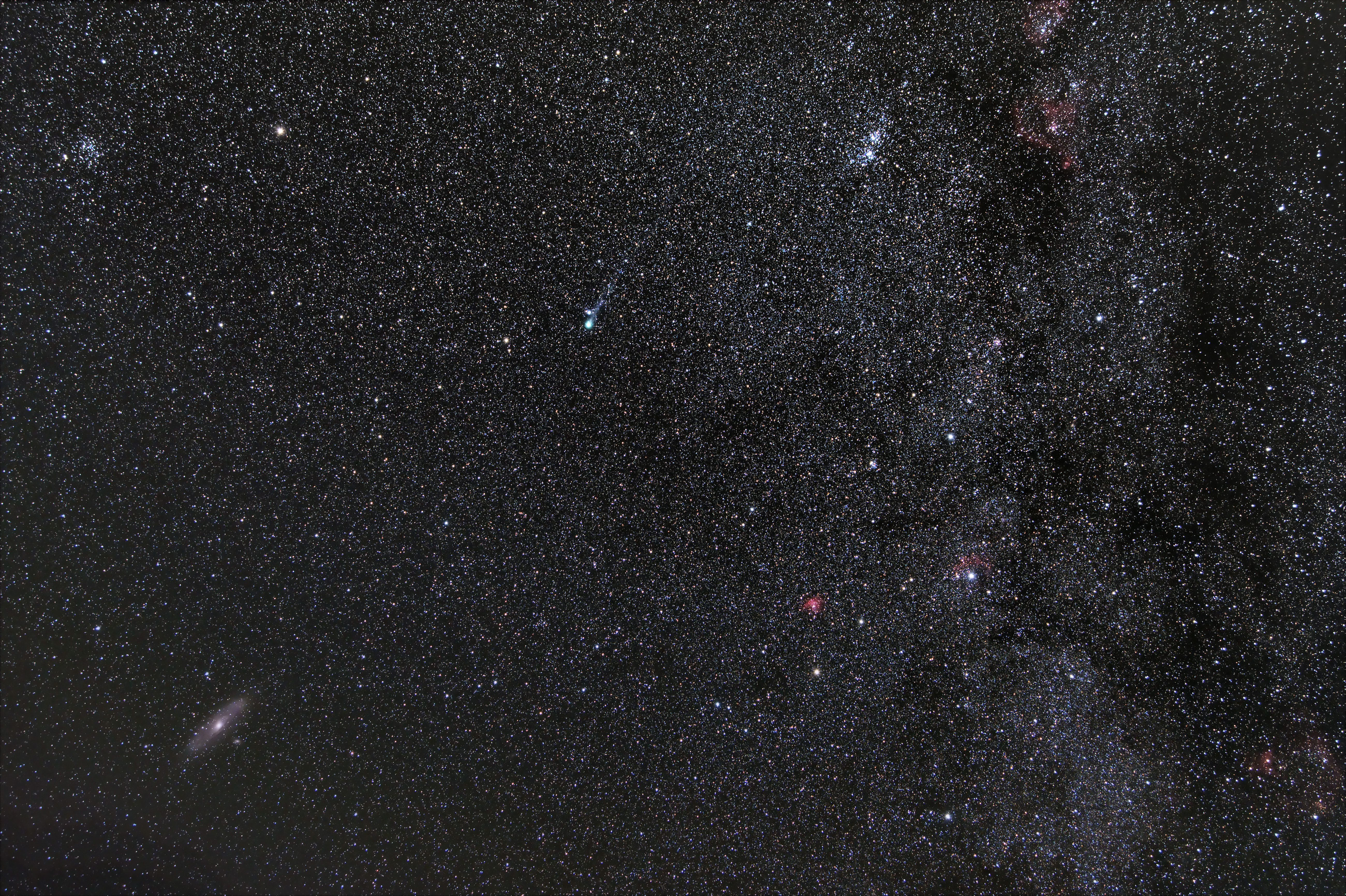 I worked very hard to obtain every minute of exposure as the field set into the treeline. This was a very challenging astroimaging feat as I had to balance the competing demands of obtaining a field wide enough to contain an area from the Andromeda galaxy to the Double Cluster with a setting sky (note the few trees in the western (lower left) sky).