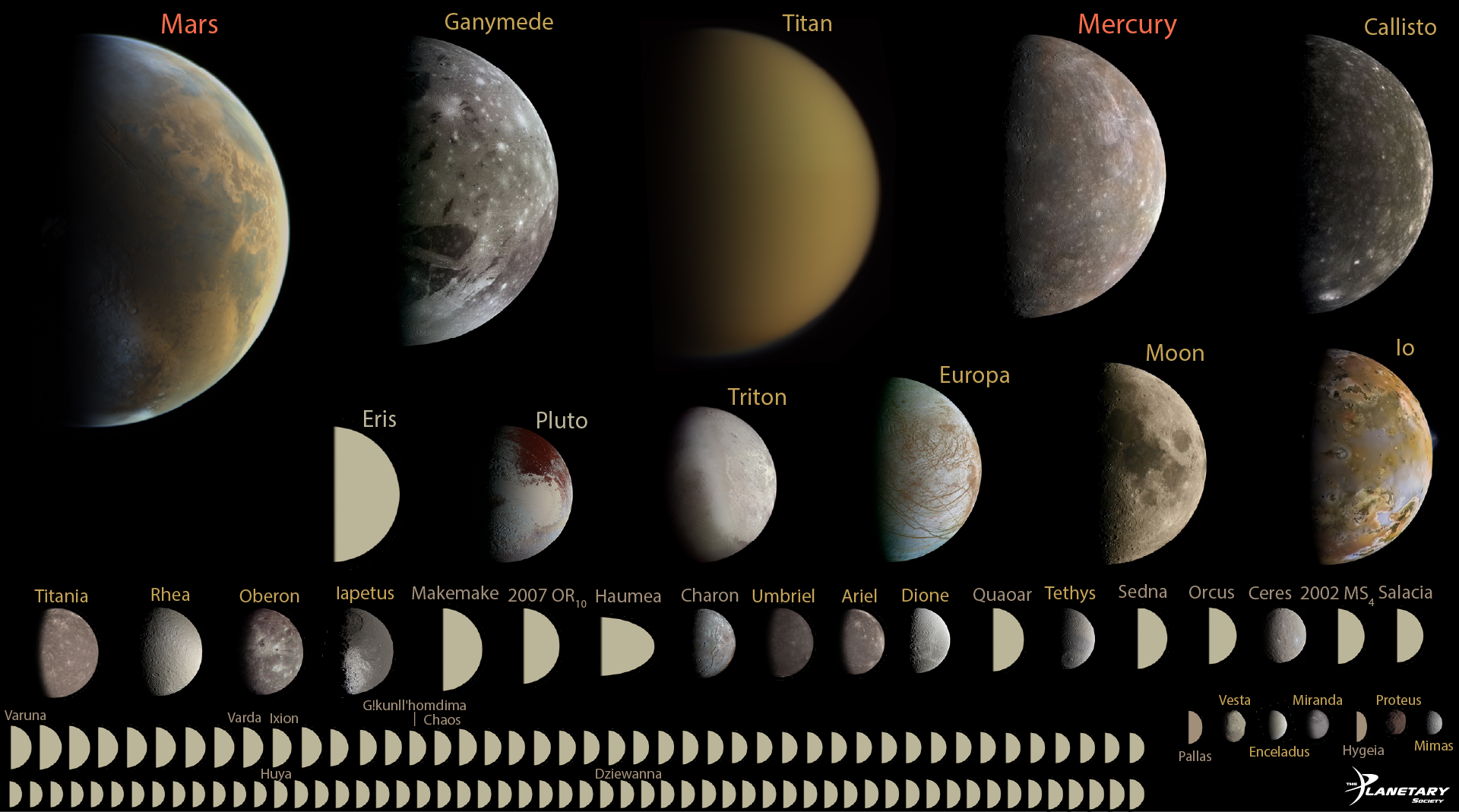 Every round object in the solar system under 10,000 kilometers in diameter, to scale