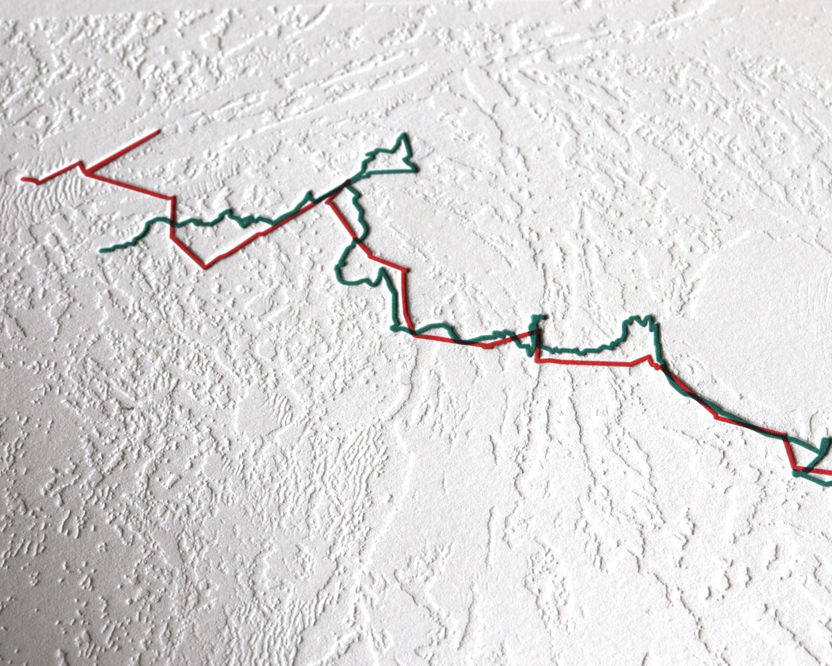 Ginny and Percy Artist and Planetary Society member Ted Ollier created this print depicting the paths taken by the Ingenuity (Ginny) drone and the Perseverance (Percy) rover across Mars' Jezero Crater. Ginny’s path is shown in red and Percy’s in green, with the Martian relief printed without ink. Ted Ollier