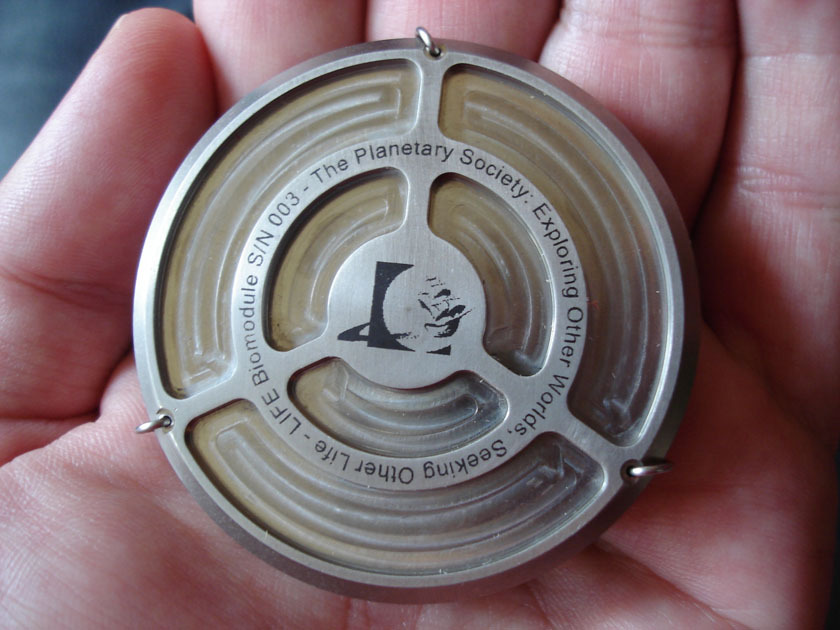 The LIFE Biomodule The LIFE biomodule, containing ten organism samples, was part of the Phobos Sample Return Mission. It is 56 millimeters in diameter, 18 millimeters in thickness, and weighs only 88 grams. Bruce Betts/The Planetary Society