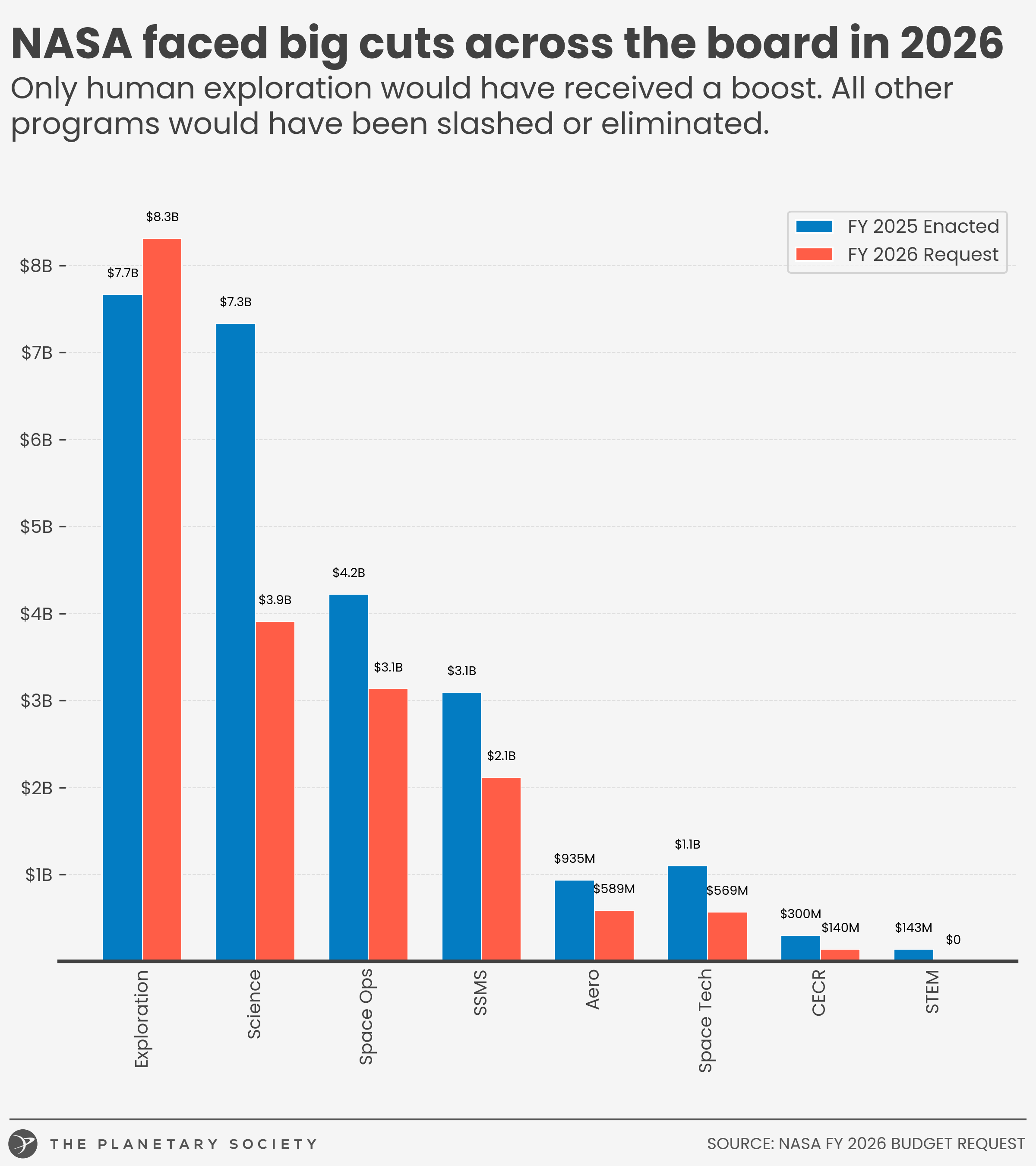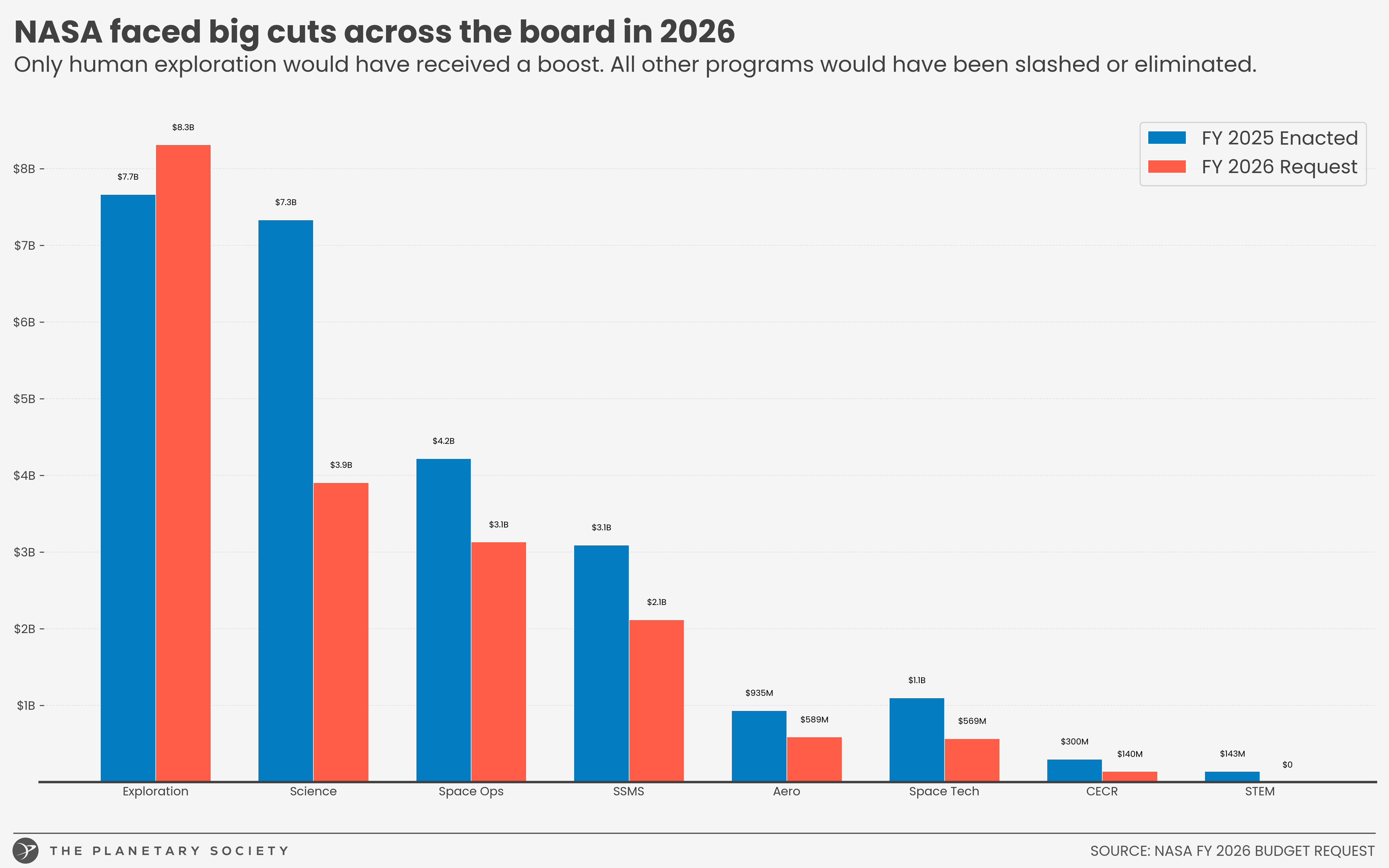 Of NASA's various mission and management directorates, only Exploration (which manages human spaceflight to the Moon and, maybe, Mars) would grow in the President's FY 2026 proposal. Every other activity would see a substantial reduction, with Science being cut nearly in half.