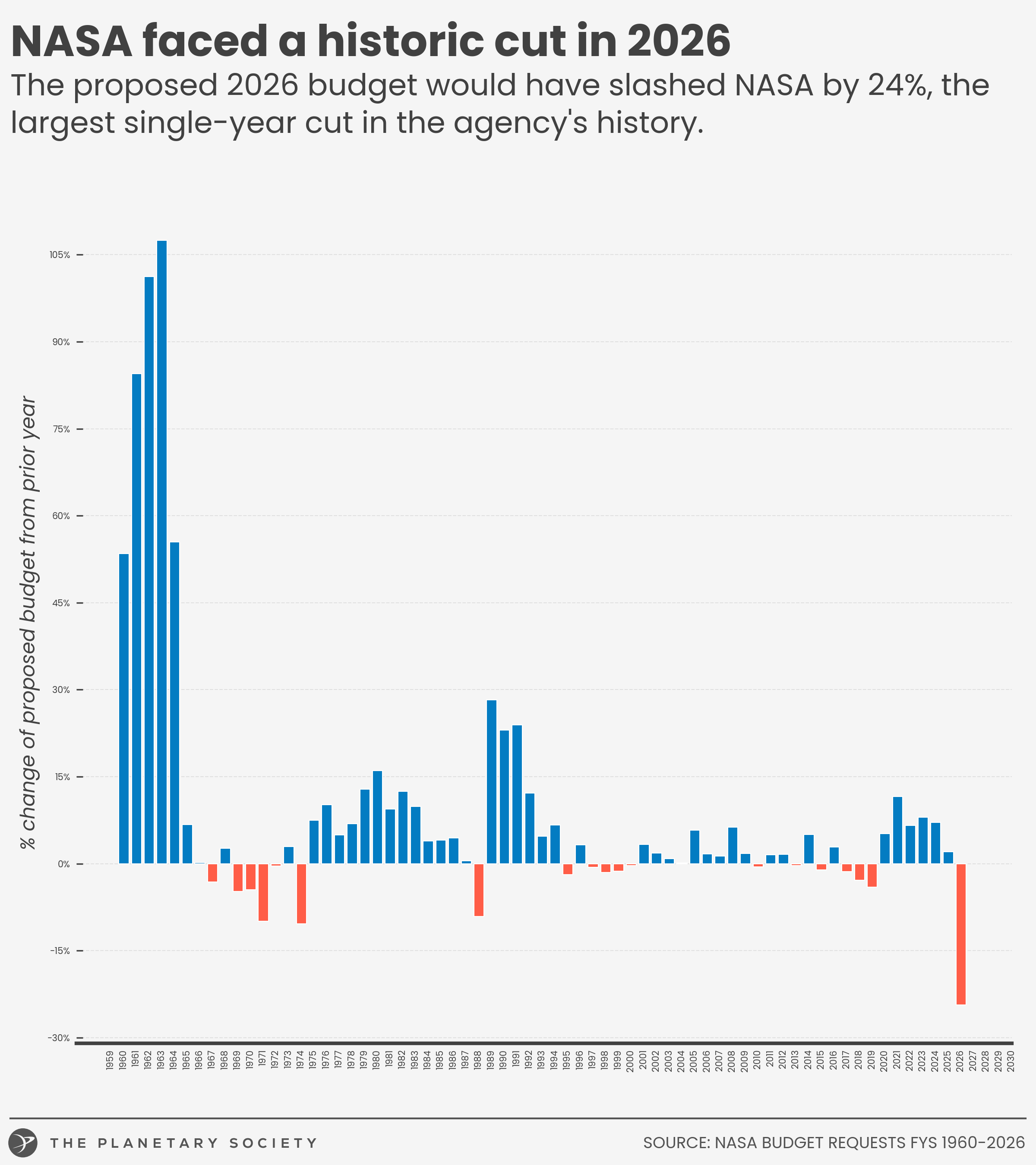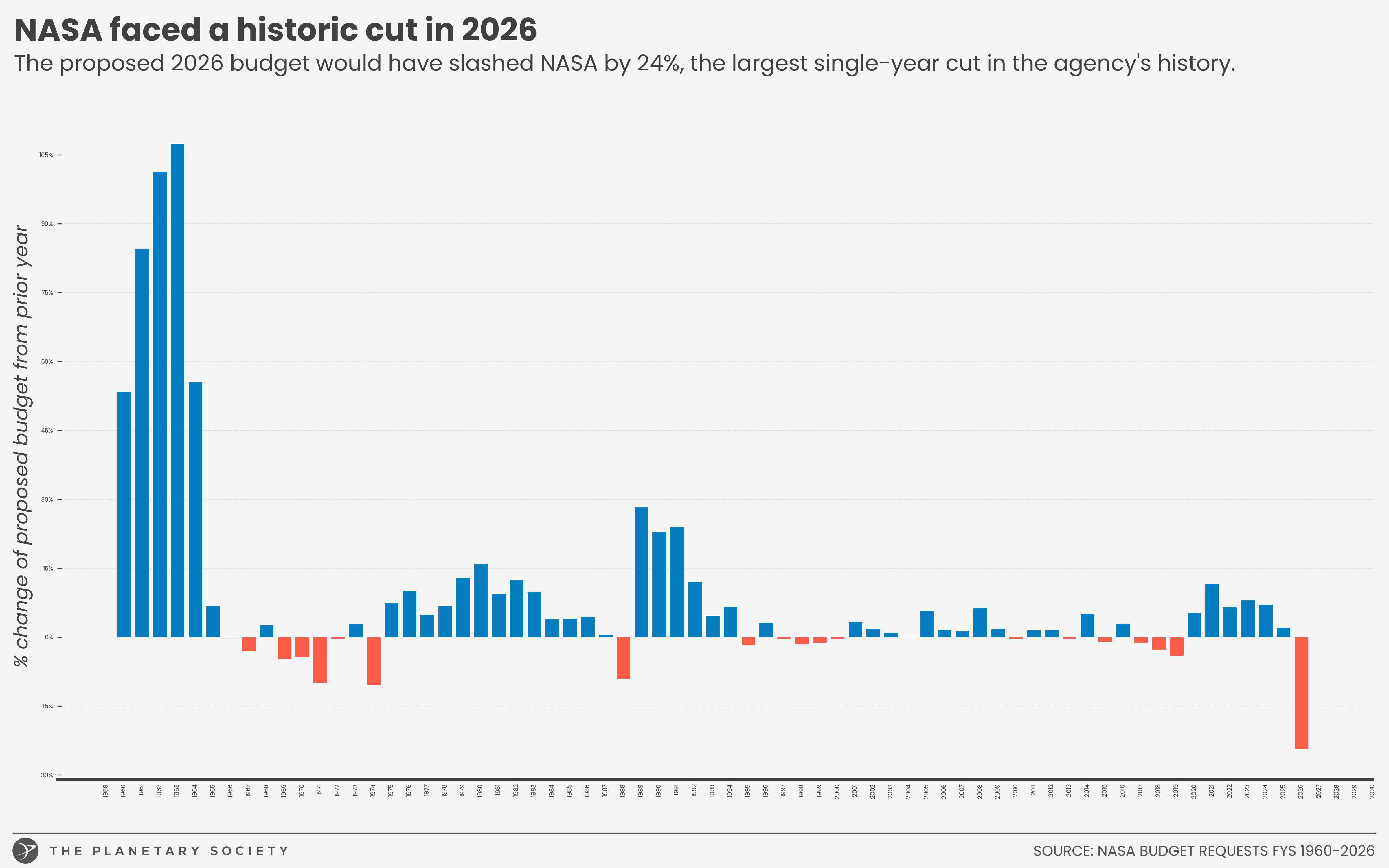 The relative change is measured by comparing the White House budget request for NASA to the prior years' congressionally appropriated amount. The FY 2026 proposed budget cut is significantly larger than any other proposed reduction in NASA's history.