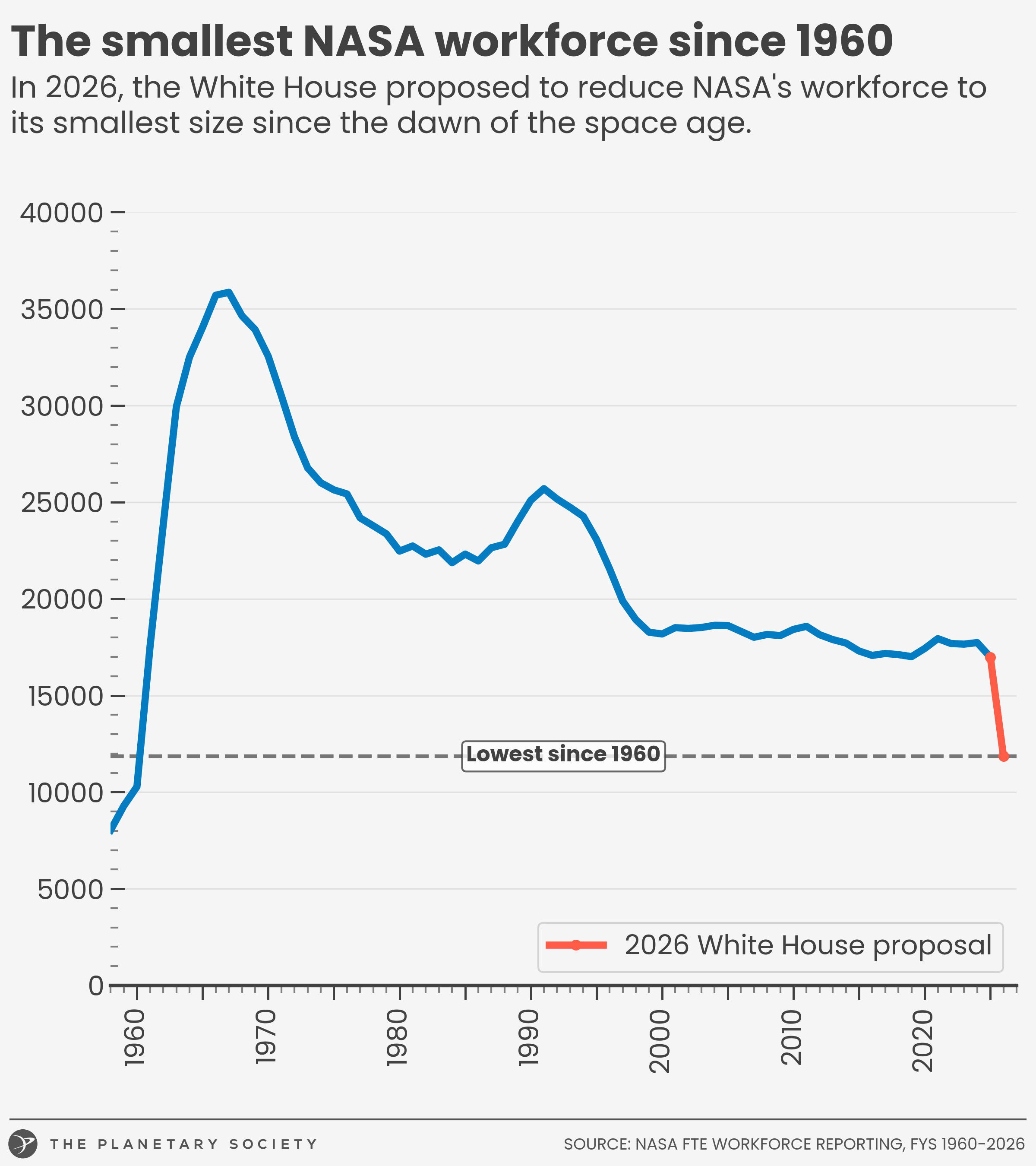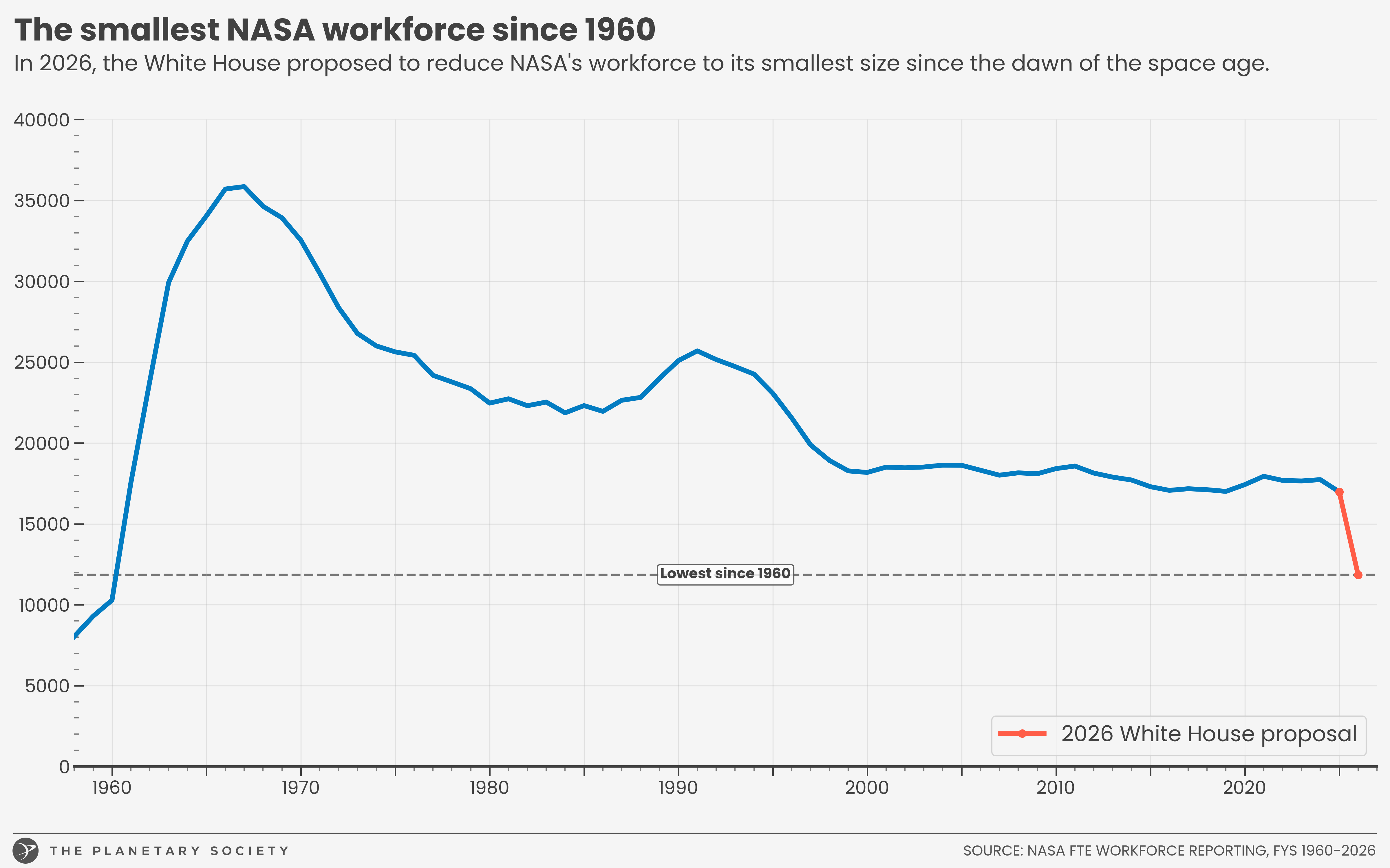 Under the FY 2026 White House budget proposal, NASA's civil servant workforce (as measured by FTEs, or Full-Time Equivalent hours) would fall to its lowest levels since FY 1960.