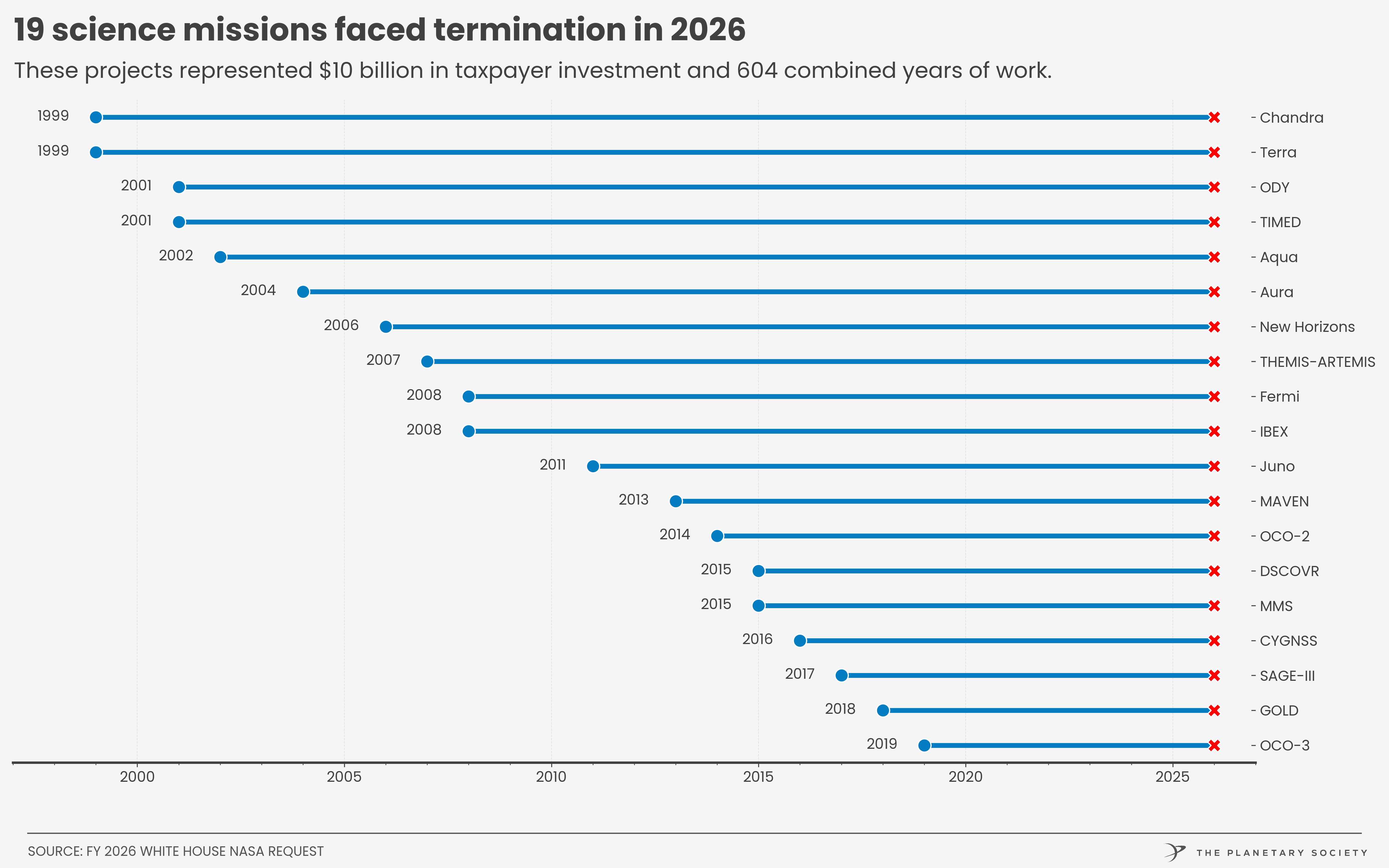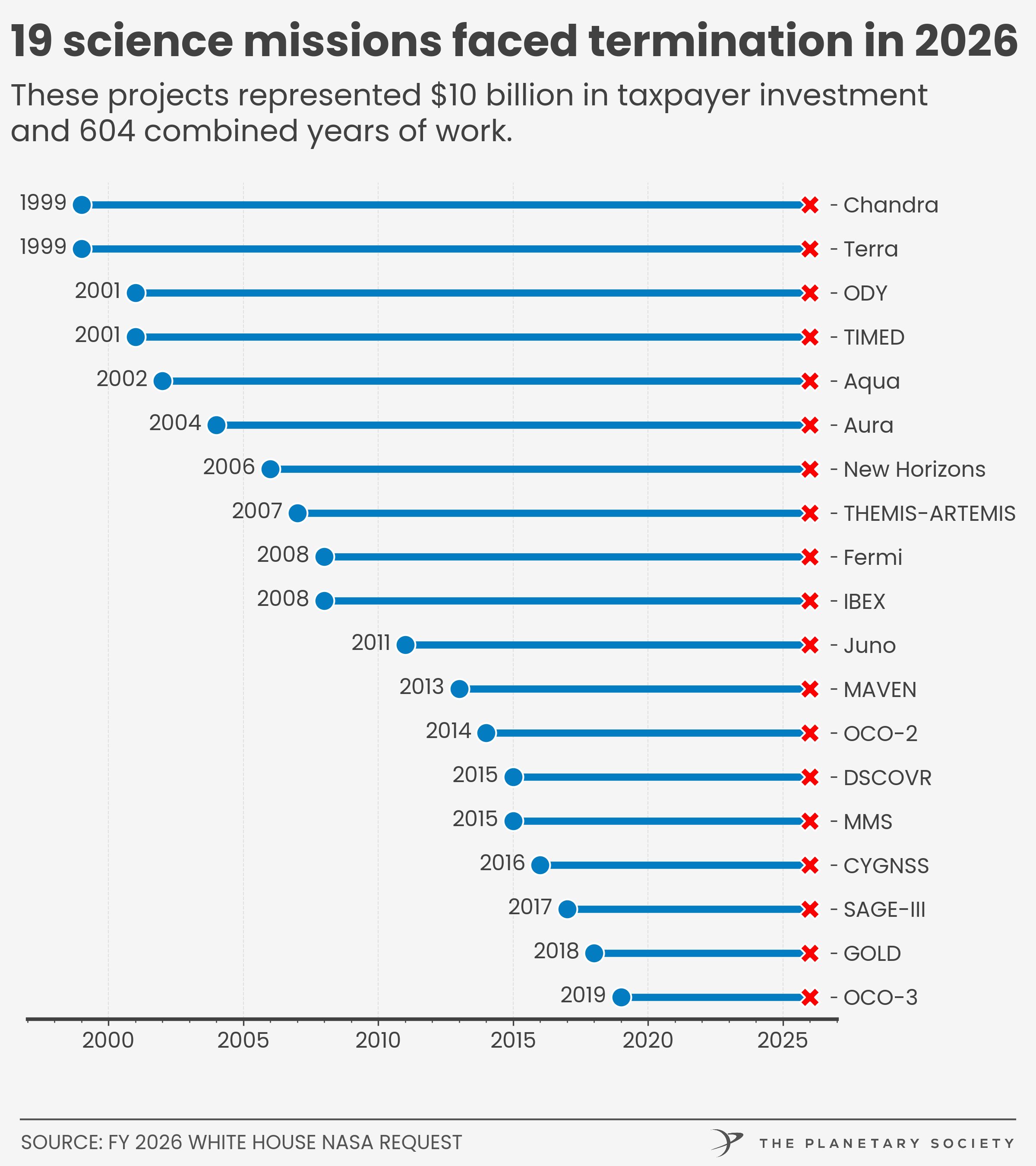 The proposed FY 2026 budget would cancel 19 NASA science missions that are currently active, healthy, and producing invaluable science. These represent a cumulative investment of over $12 billion and years of work to design and build. These are irreplaceable assets.
