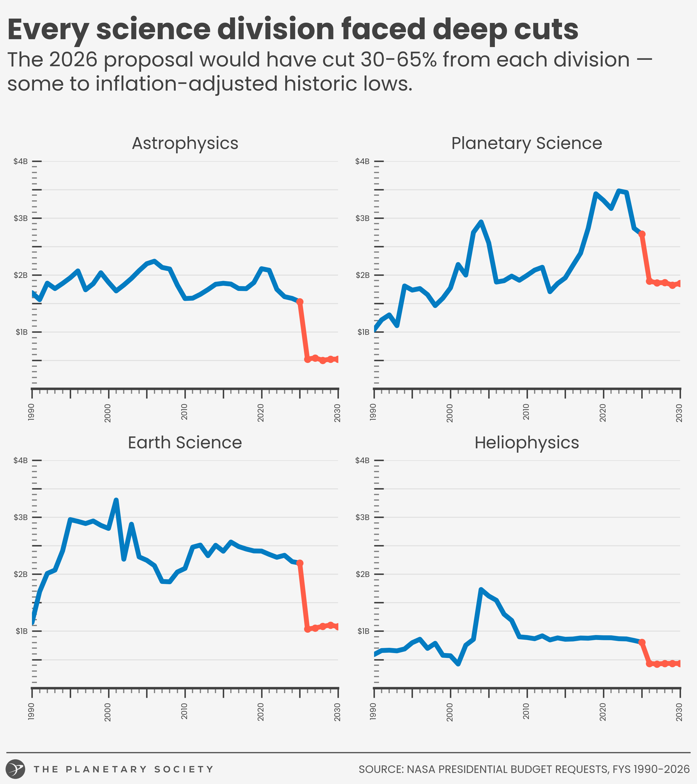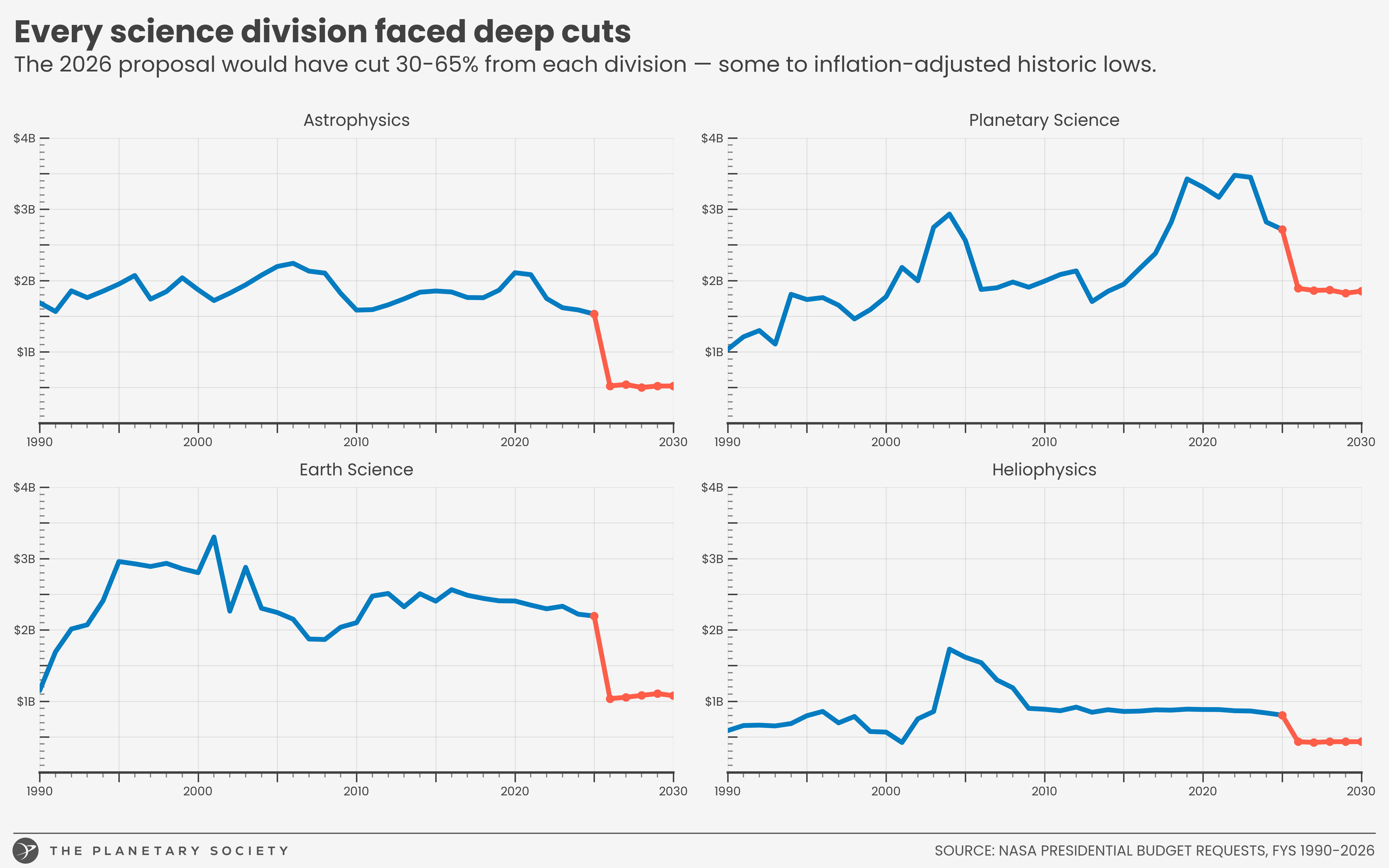 No science is spared. Each of NASA's four largest science divisions faced a draconian cut to its budget, with some reaching historical lows. Values are adjusted for inflation.